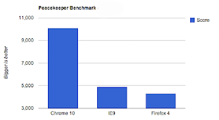 Notiamo subito che Chrome 10 si impone alla grande su almeno 2 test, non credo che la differenza tra questi browser sia davvero il Javascript, credo invece che la differenza sia il pieno supporto alle nuove tecnologie come HTML5, CSS3, WebGL ecc...