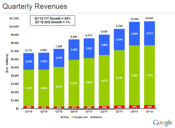 Google ha messo a segno una trimestrale da record: nel primo trimestre 2012 ha registratoun'impennata degli utili del 61%, equivalenti a 2,89 miliardi di dollari o 8,75 dollari per azione, su un fatturato di 8,14 miliardi dollari esclusi i costi di acquisizione traffico. Nello stesso periodo dello scorso anno aveva incassato "solo" 1,8 miliardi, pari a 5,51 dollari per azione. I ricavi sono stati di 10,65 miliardi di dollari, rispetto agli 8,58 miliardi di dollari dello scorso anno: anche qui un balzo in avanti pari al 24,1 per cento.